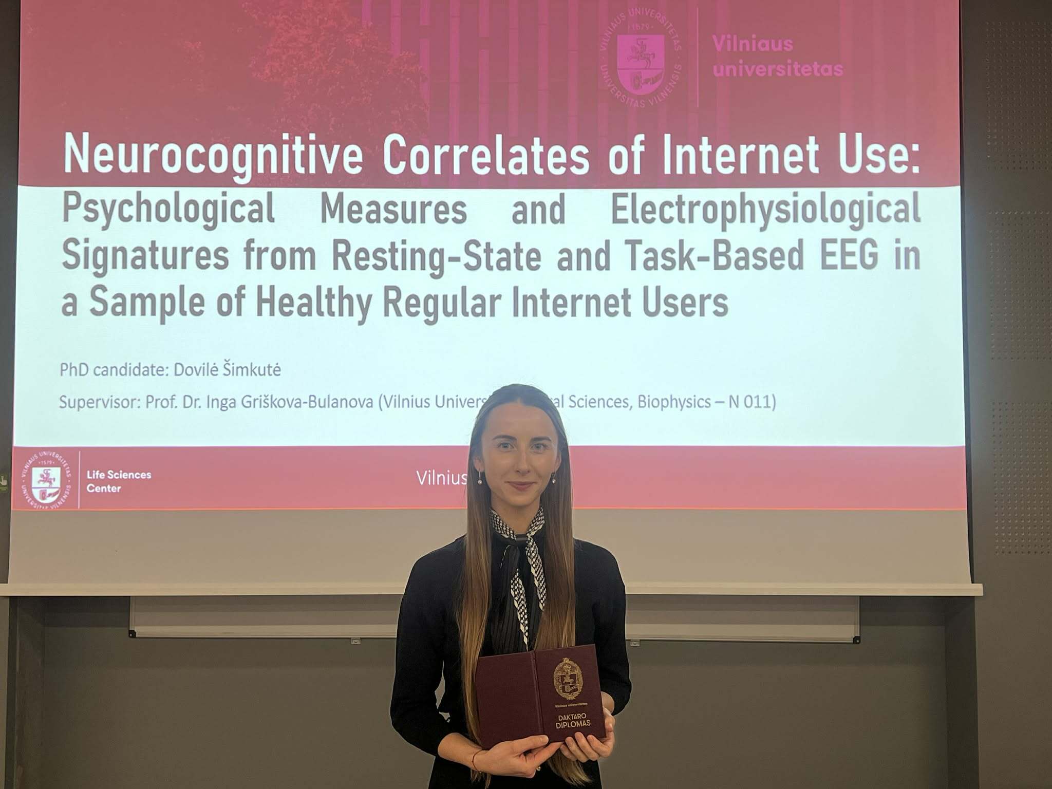 Dovilė Šimkutė defended her thesis entitled "Neurocognitive Correlates of Internet Use: Psychological Measures and Electrophysiological Signatures from Resting-State and Task-Based EEG in a Sample of Healthy Regular Internet Users" for the degree of Doctor of Science in Biophysics.